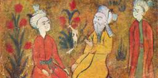 Hazrat Amir Khusro teaching his disciples in a miniature from a manuscript of Majlis al-Ushaq by Sultan Husayn Bayqara